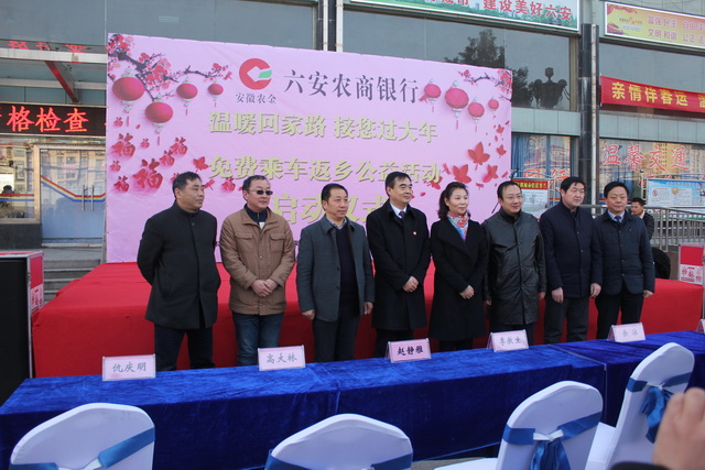 1月20日上午9时,“温暖回家路,接您过大年”免费乘车返乡公益活动启动仪式在客运南站站前广场举行。此次活动由六安农商银行主办,六安市交通运输局、六安市公路运输管理处协办。六安市市政府余泳副市长出席并宣布活动正式启动。六安市交通运输局党组成员,运管处处长李教生,农商银行党委书记、董事长贡献分别致词。