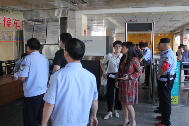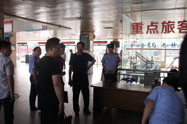 在客运南站售票大厅、候车大厅,王队长一行观摩了旅客进站实名制购票、安检、检票等一系列工作流程后。赵胜介绍说,为了能够顺利实施实名制购票乘车查验,车站前期做了大量准备工作,组织员工进行学习培训,安排人员负责实名制购票宣传解答及引导未随身携带身份证的旅客前往驻站派出所开具临时身份证明购票出行,在站前广场、售票厅的LED屏上、售票大厅、售票窗口发布了实名制购票的宣传信息,向旅客宣传实名制政策的实施等等。