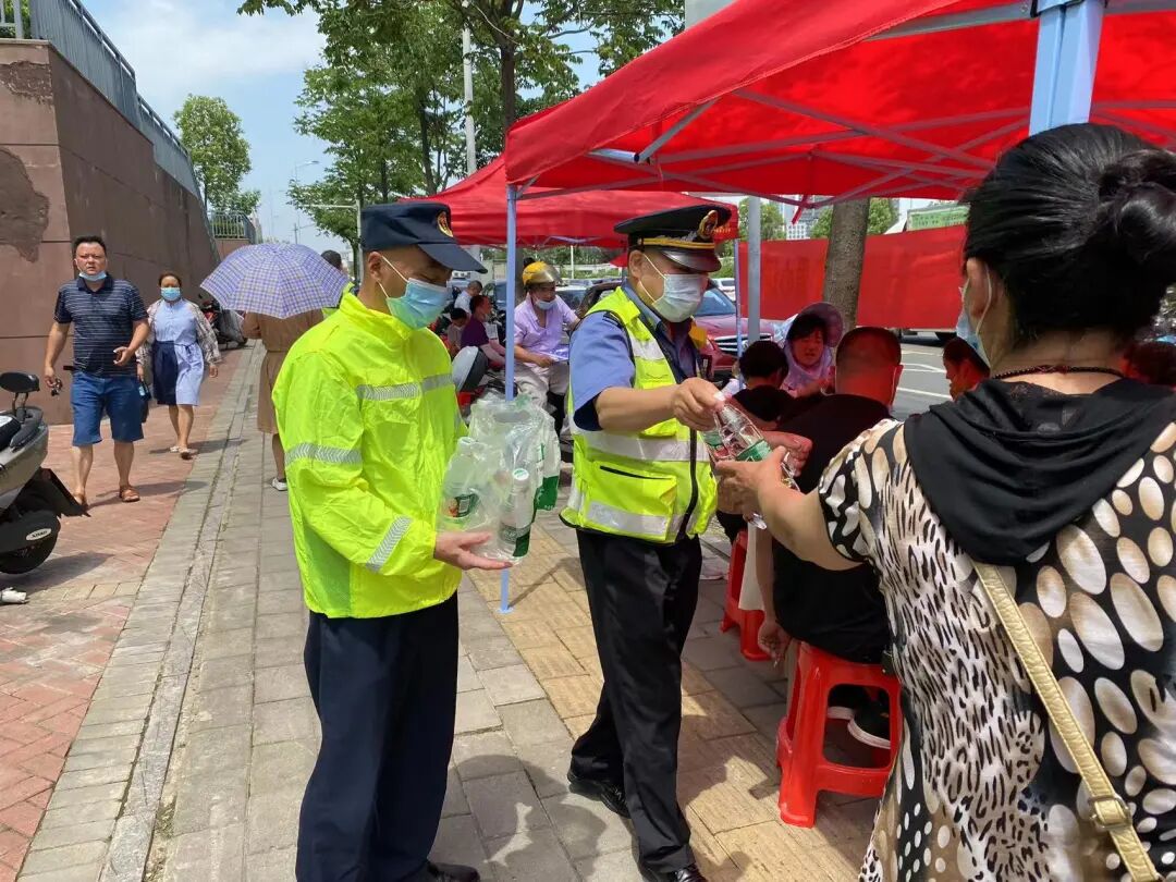 高考过程中,场内的学子奋笔疾书,场外的父母焦灼等待,炎炎烈日,他们守在门外,6月8日上午高考进行时,市执法一大队执法人员在辖区内考点(六安市技师学院、六安一中东校区、六安市金安路初级中学)不间断巡查,重点检查出租车、网络预约出租车违法违规行为,保障运输考生车辆安全、优先通行,保障考场周边交通秩序良好。执法人员看见了场外的父母扛着烈日等在门外,便搬出携带的矿泉水,给考点外等候的家长分发降温的矿泉水,并给出祝福,原本紧张的家长此刻也变得放松起来。
